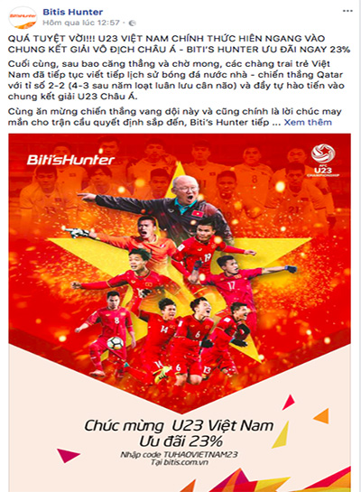 Cảm xúc vỡ òa hẳn là những gì đang diễn ra ngay lúc này, không chỉ với cá nhân những người hâm mộ bóng đá mà còn với cả bất cứ người Việt Nam nào. Và tất nhiên, các thương hiệu cũng không thể bỏ lỡ một cơ hội đầy ý nghĩa và xúc động như thế này. Mã giảm giá 23%, đồng giá 23k, code 23 và hàng loạt các chương trình liên quan khác ngay lập tức lên sóng tại thời khắc U23 Việt Nam ghi tên mình vào chung kết AFC. Đây quả là một dịp để các “ông lớn” tranh thủ “bắt sóng nhịp đập của thượng đế” với sự thấu hiểu tâm lí và độ “chịu chơi” theo dòng sự kiện của mình hay còn gọi là chiến lược Occasion-based Marketing.